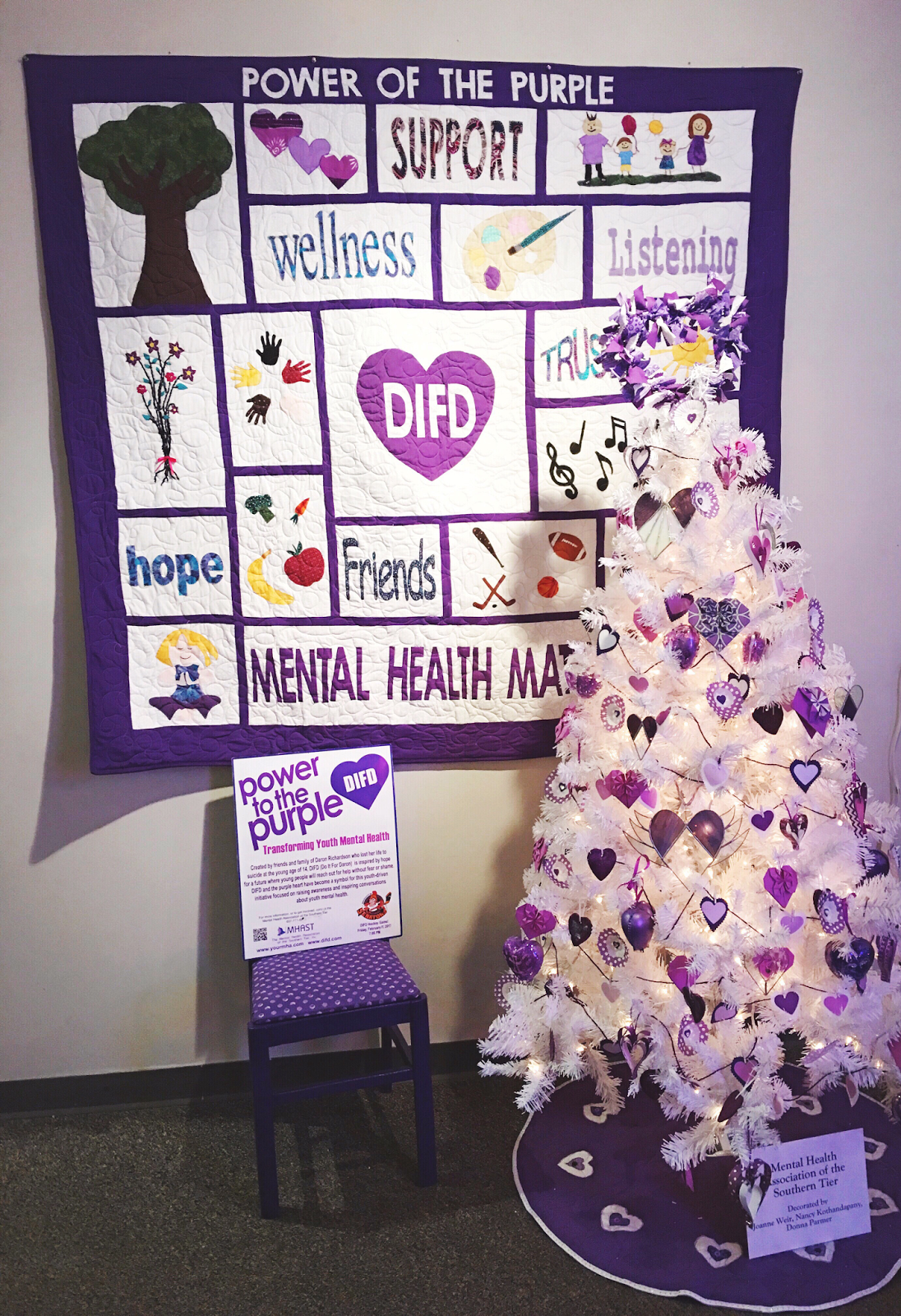 As we went back into the Science Center to head out to the exit, we noticed one more tree waiting. It's a very special tree. Our local hockey team, the Binghamton Senators (the AHL affiliate of the NHL Ottawa Senators) started the group Do It For Daron after Coach Richardson's daughter Daron committed suicide in 2010 at the age of 14. DIFD encourages young people to openly talk about mental illness and ask for help. It also provides them and their parents, coaches, teachers, and other adults with the resources and courage needed to overcome the shame and fear of discussing mental illness. A purple heart was chosen as the symbol because purple was Daron's favorite color, and it is a visual reminder that only love and awareness can combat youth mental illness.